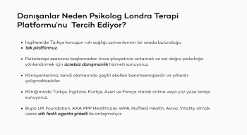 Liverpool Street, City of London’daki merkezimizde, İngiltere genelinde Türkçe konuşan bireylere ve ailelere kaliteli, güvenilir ve kapsamlı ruh sağlığı hizmetleri sunuyoruz. Psikiyatristler, uzman psikologlar, psikoterapistler, dil ve konuşma terapistleri, ergoterapistler, çocuk gelişim uzmanları, diyetisyenler ve aile danışmanlarından oluşan geniş ekibimiz, bireysel ve aile temelli destek ihtiyaçlarınıza yönelik çözümler sağlamaktadır.