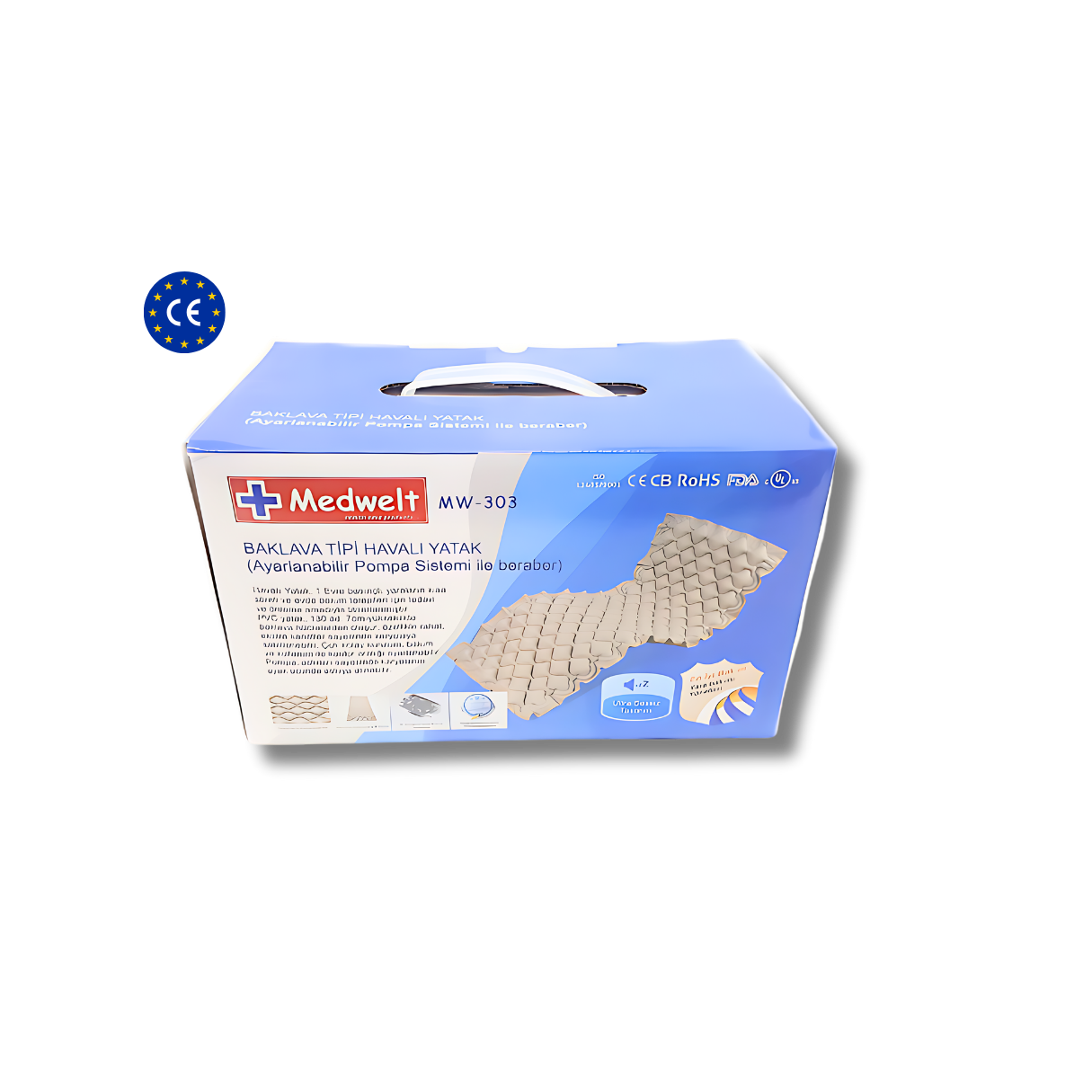 MEDWELT-Baklava Tipi Havalı Yatak, uzun süre yatağa bağımlı olan hastalar için tasarlanmış yüksek kaliteli bir üründür. Basınç yaralarını önlemek ve hastaların konforunu artırmak için gelişmiş teknoloji kullanılarak üretilmiştir. Bu yatak, hastaların cilt sağlığını korur ve tedavi sürecini destekler. Hem evde bakım hem de sağlık kuruluşlarında kullanım için idealdir.